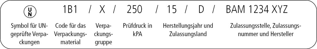 Die Kennzeichnung beinhaltet das Symbol für UN-geprüfte Verpackungen, den Code für das Behältermaterial, Verpackungsgruppe, Prüfdruck in kPa, Herstellungsjahr, Zulassungsland, Zulassungsstelle, Zulassungsnummer und Hersteller.