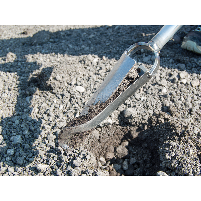 With slightly rounded, oblique scoops which pull themselves downward in the gravel. Any stones present are clamped between the drill sides. Finer soil material (coarse sand with fine gravel) is retained in the drill bit.