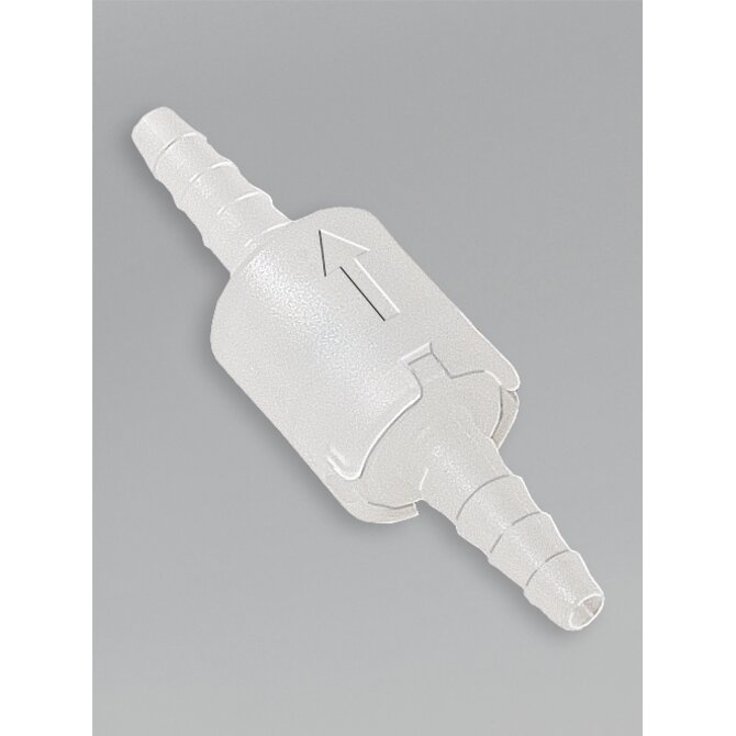 Válvula de retención con flecha direccional en relieve impresa en negro.