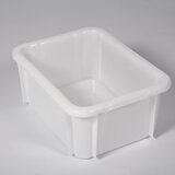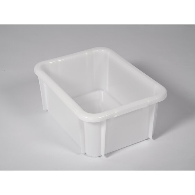 Seine weiße Farbe erleichtert die Sichtprüfung auf Rückstände, während abgerundete Innenkanten und glatte Flächen eine schnelle und gründliche Reinigung ermöglichen. Die geschlossenen Griffmulden und Seitenwände ermöglichen einen sicheren Transport und die Lagerung von verschiedensten Materialien.