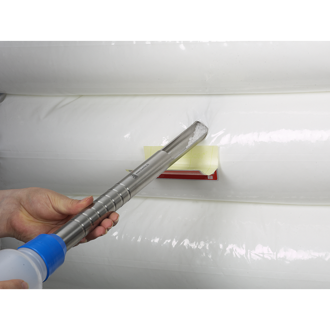 Probensammler für Pulver im Pharma-Bereich, aus Edelstahl V4A, Werkstoff 1.4404. Die besonders schlanke Spitze lässt sich leicht und tief einstechen, um die Stichprobe zu sammeln. Durch den konischen Zulauf der Spitze können kleinste und größere Mengen gezogen werden. StickProof ist aus einem Stück gefertigt, ohne Kanten, Rillen und Hinterschneidungen für eine einwandfreie und einfache Reinigung. Die Probe kann direkt am Auslaufende in den Probenbeutel gefüllt werden. Befestigung des Beutels mit stabiler Halteklammer.