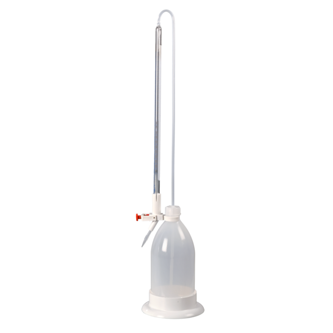 Die Bürkle-Dosierarmatur ermöglicht eine präzise Dosierung und exakte Feintitration über den Druckknopf oder über die Mikroschraube sowie einen exakten Auslauf über die feine Auslaufspitze.