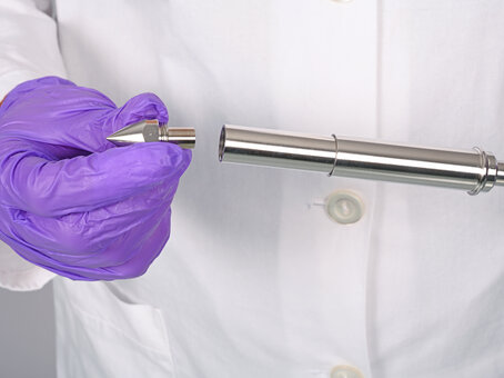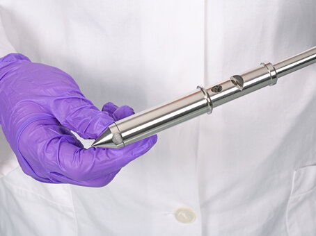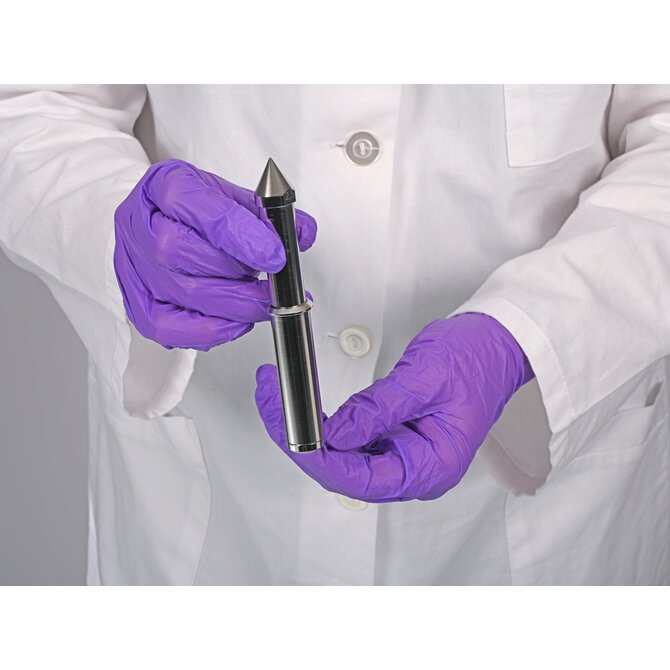 Die Sammelbombe ist der Probenaufnahmezylinder des PharmaPicker-Systems. In diese Edelstahl-Kammer wird die jeweilige Volumenspitze vorne eingesetzt. Beim Einstich in das Pulver füllt sich die Spitze; beim Hochziehen verbleibt das Probevolumen dann in der Sammelbombe. Die Sammelbombe ist in zwei Größen verfügbar, passend zum jeweiligen Volumenbereich der Spitzen. Sie ist glatt und rückstandsfrei reinigbar sowie sterilisierbar. Die Sammelbombe stellt sicher, dass die entnommene Pulverprobe sicher verwahrt wird, bis sie analysiert wird, und ermöglicht den schnellen Volumenwechsel durch Austausch der Spitzen.