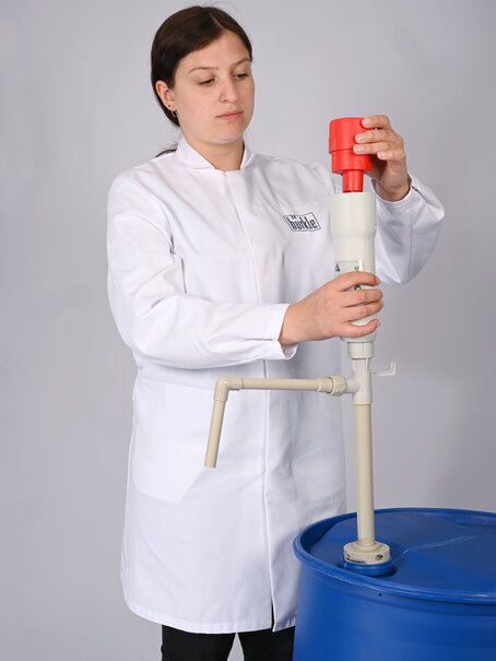 Light and powerful drum pump for small quantities, e.g. in laboratories. Ideal for filling and transferring low viscosity or aqueous acids, alkalis, chemicals, cleaning agents etc. with a viscosity of up to approx. 200 mPas.