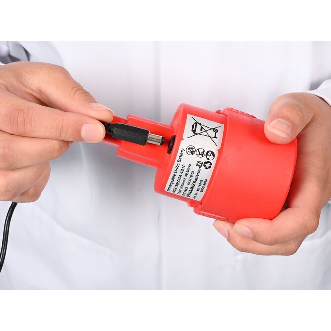 - The drive is supplied with power either by the battery or the mains adapter. Connect the charged battery or mains adapter to the pump.