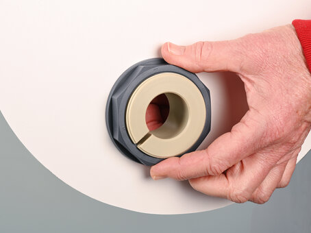 Also for wide-necked screw caps. The screw joint 2" is screwed on from the inside using lock nut 2". (Mounting holes in the container 60 mm).