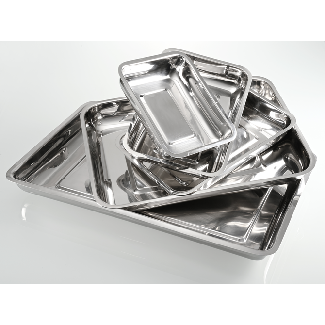 This rectangular, shallow stainless steel bowl impresses with its robust workmanship and high functionality. Made of high-quality stainless steel 1.4301(304), it offers excellent corrosion resistance. The bowl is ideal for use in demanding environments where hygiene is critical, such as laboratories, food processing facilities and pharmaceutical plants. Its low design makes it easy to insert and remove instruments or samples, while also improving overview and accessibility in everyday working life. Despite its compact dimensions, the bowl provides ample space for storing, sorting or transporting utensils safely. The smooth, easy-to-clean surface meets the highest hygiene standards and facilitates safe working practices.