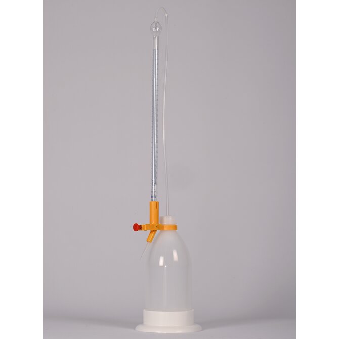 Precise dosing using the press button, exact fine titration with the micro-screw and precise discharge jet. Graduation according to Category B (Tolerances according to DIN EN ISO 385).