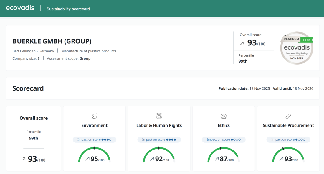 ¡La sostenibilidad, la colaboración ética y los derechos humanos son de gran importancia para Bürkle! Para nosotros, es muy importante tratar estos temas con transparencia. Por ello, hemos optado por una evaluación a través de EcoVadis, para que usted pueda consultar nuestros resultados de forma transparente y sin invertir mucho tiempo.