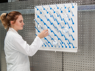 Las varillas, de gran estabilidad, se pueden insertar y enclavar de forma individual en los agujeros del escurridor y cambiar de posición en todo momento. El escurridor, en combinación con las varillas intercambiables de tres longitudes diferentes (60 mm, 100 mm y la prolongación a 150 mm), se puede adaptar a los recipientes a los que se tiene que efectuar el secado.