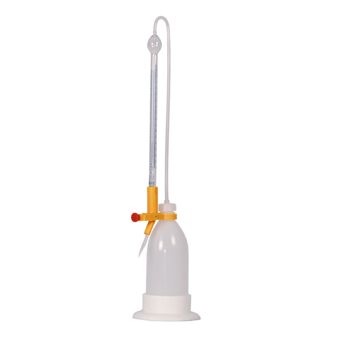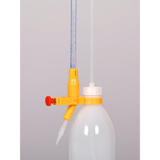 Dosage précis avec bouton poussoir, titrage fin et précis avec vis micrométrique et pointe d'écoulement précise. La graduation correspond à la classe B (tolérances selon DIN EN ISO 385).