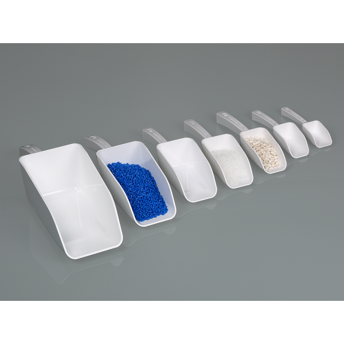Pá graduada universal para encher e medir pós e grânulos. Para uma medição exata, a pá graduada deve ser enchida em excesso e o excesso na borda superior da pá deve ser removido.